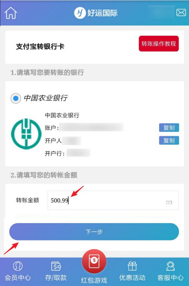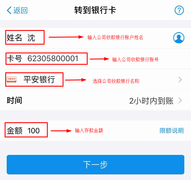 请您记录好公司收款银行账户,填写您的转账金额,点击下一步。