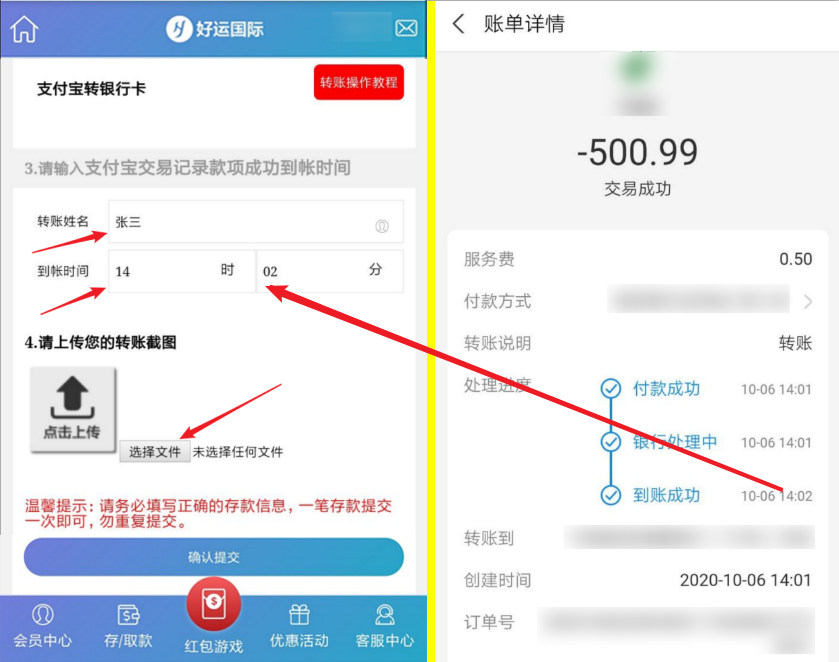第五步:当您的支付宝款项到达公司收款账号内时,您的支付宝账单详情会显示到账成功,您在登陆平台提交下您的存款数据,财务人员在查收到您的款项,核对您的存款数据无误后,会在3分钟内为您添加额度,刷新页面即可查收。